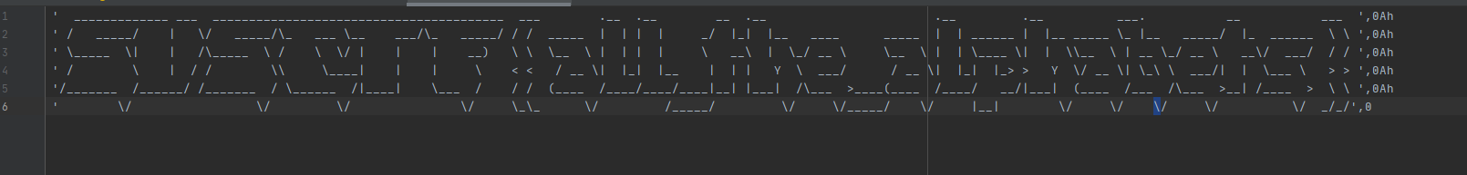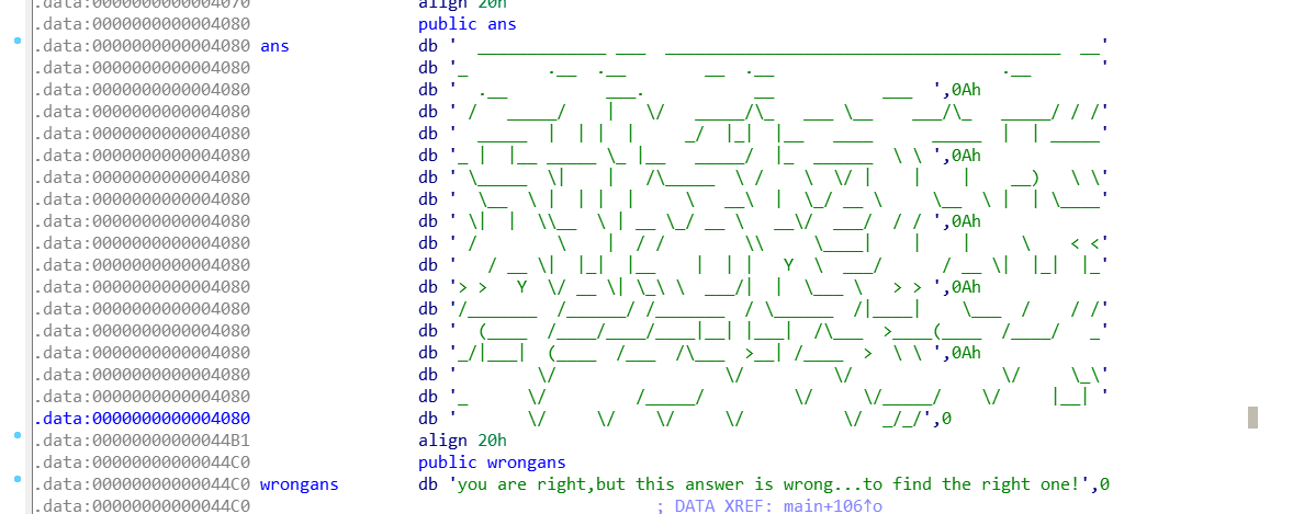 main()中注意到有一个wrongans很可疑,查看一下,在其相邻的地方有 - 这就很有意思了,太像一个Banner了,其中还有0x0AH的格式,猜想是需要重新调整格式得到想要的flag,用文本编辑器调一下即可,得到