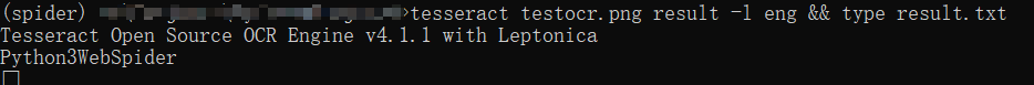 tesseract testocr.png result -l eng && type result.txt,其中调用了tesseract命令,第一个参数为图片的名称,-l指定使用的语言包,这里的eng表示使用英文,result.txt是保存的结果
