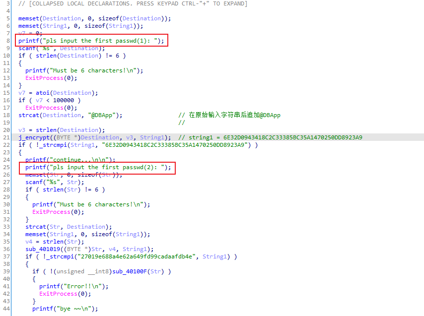 - 通过password1后还有一个password2,看一下就是输入长度为6的字符,然后追加Destination,再经过一个函数进行处理,处理函数和上文的哈希类似。