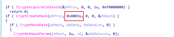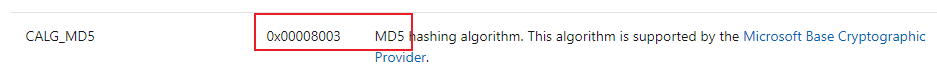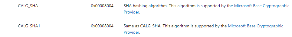 所以,第二个参数无符号数0x8004应当指哈希算法的类型,点击页面提供的超链 ALG_ID 可以发现这个值意味着使用的哈希算法是SHA1