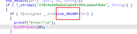 不过算法变成了MD5 - 如果 MD5(str+Destination) 结果为27019e688a4e62a649fd99cadaafdb4e,还要经过 sub_40100F函数对输入的字符串str进行判断