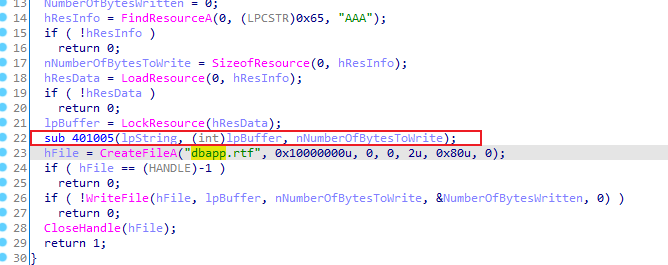 进入该函数,首先定位一个名为AAA的资源文件,采集文件信息并通过函数 sub_401005 这里的lpString就是前文提到的str也就是我们第二次输入的password,查看微软文档中SizeofResource和LockResource的return值可知,lpBuffer是指向资源文件第一个字节的指针,nNumberOfBytesToWrite为资源文件的字节数,进入该函数