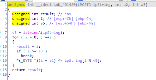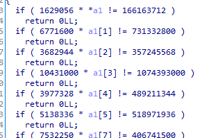 - 为什么dword——601078那一条语句没有lodword函数却依然和有lodword函数的结果相同,这是由于dword_601078这个变量只能存储2个字节的数据,因此在读取v6[j]时只能读取其前两个字节,那么效果其实就跟lodword一样了