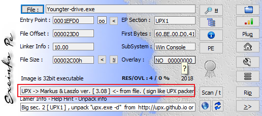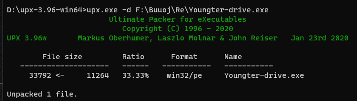 - 用IDA打开时,提示文件被损坏,有可能被加壳,用Exeinfo PE查看是UPX,所以用upx工具脱壳,重新拿到IDA即可
