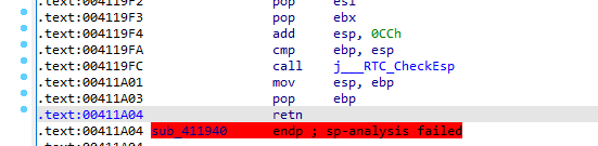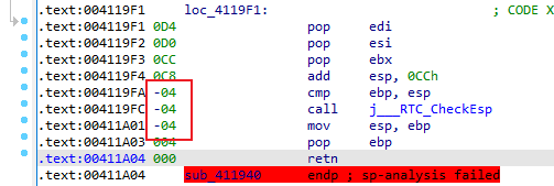 - 查看第一个线程的起始地址StartAddress,最终发现报栈指针错误(如果无法反编译需要按以下步骤调整栈指针)