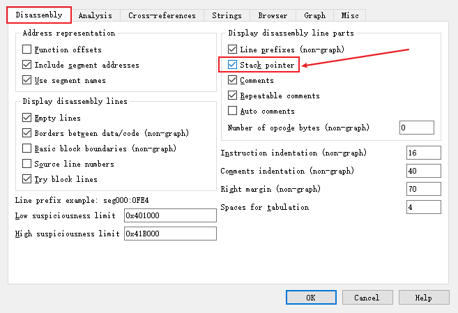 b. 为了能看到栈指针的值并做修改,需要 option->General->Disassembly->Stack pointer 勾选即可