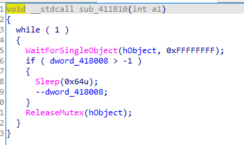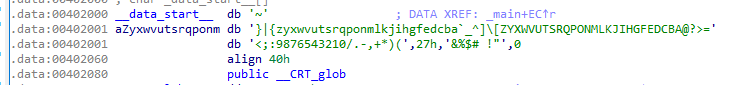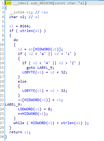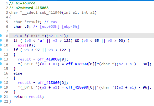 a2是后面要提到的线程2的递减指针。该函数对字符数组off_418000进行操作,该字符数组内容为 “QWERTYUIOPASDFGHJKLZXCVBNMqwertyuiopasd” 基本的逻辑如果字母小于’a’或大于’z’就减去38,否则就减去96