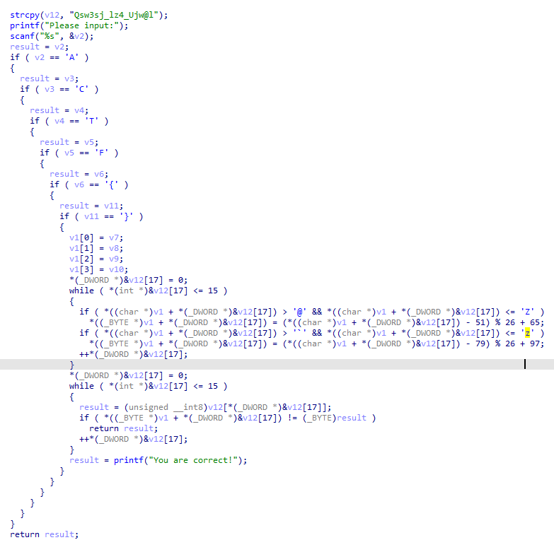 可以看到首先确定了flag的格式,为ACTF{}(这里是BUU所以flag格式实际还是flag{},可以暂不考虑),另外第一个while实际上在做移位,而我们也没有必要非得逆着写代码,只要从0~127遍历字符,遇到变换后和v12中对应字符相等的就追加到flag字符串即可