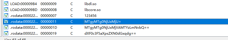 将apk文件解压,将lib中的libcore.so文件拖到IDA64查看字符串,发现几个base64编码