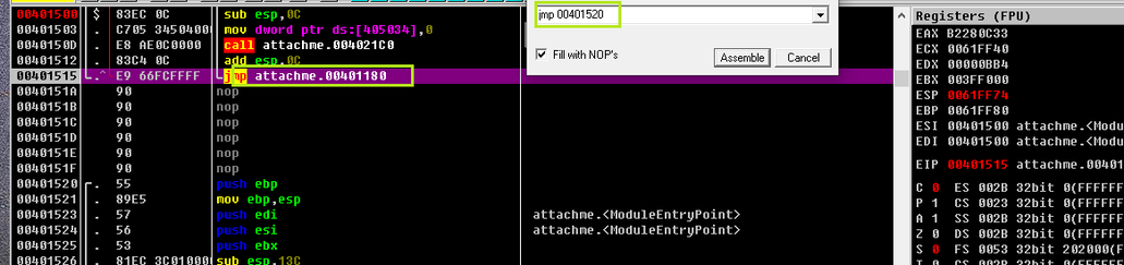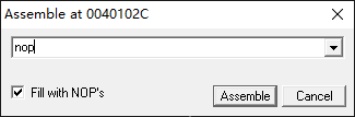 - 将可执行文件拖入OD,找到对应地址。双击将其用nop填充
