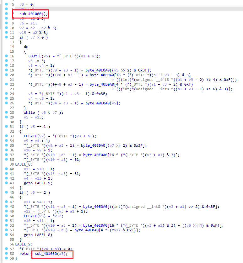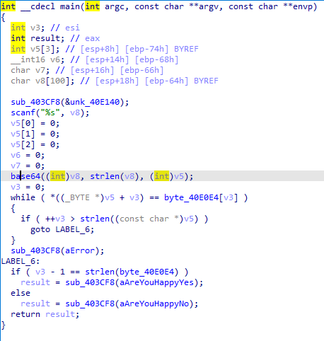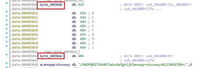 输入字符串后,首先对字符串进行Base64编码(这里的base是人为修改的,因为进入该函数能发现明显的Base64特征)。然后判断结果是否与byte_40E0E4相等