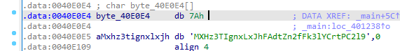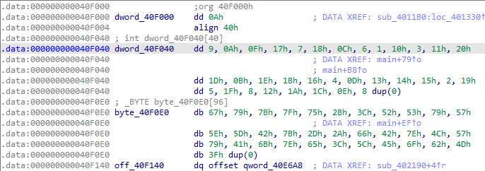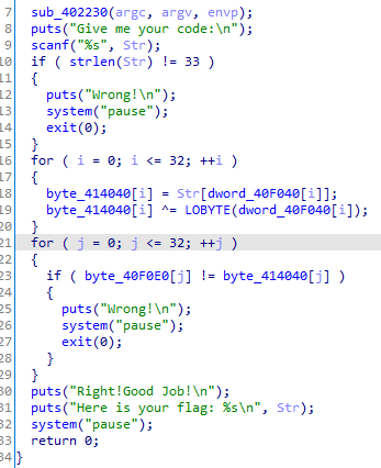 - main函数如下,首先输入字符串,可以推断其长度为33,原始字符串数组先用40F040做索引生成新数组再,与40F040进行异或需要与40F0E0相等