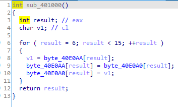 - 第一次修改为:交换byte_40E0AA和byte_40E0A0两个数组[6,15)处的值