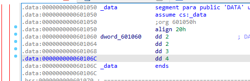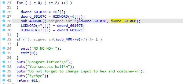 - 这里dword_601078是取了每个v6元素四个字节中的后两个字节中的值,dword_60107c则是取了每个v6元素四个字节中前两个字节的值