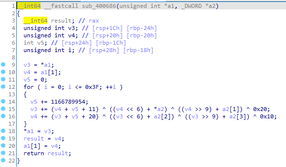 - sub_400686中对输入的数据两个两个一组进行异或加密