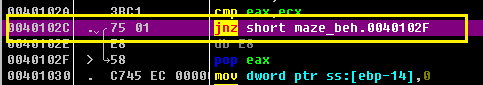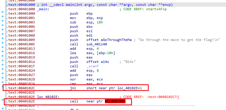 - jnz到下一行代码,相当于没做跳转。另外call调用的地址找不到,可以推断出这段代码添加了花指令。