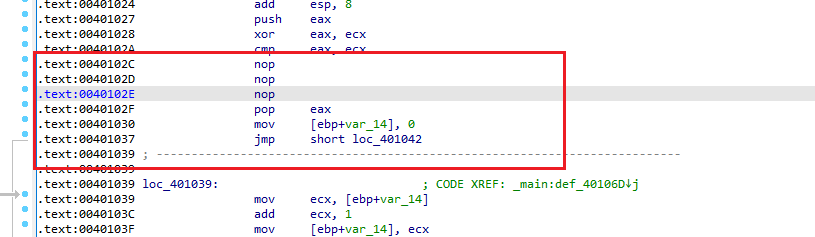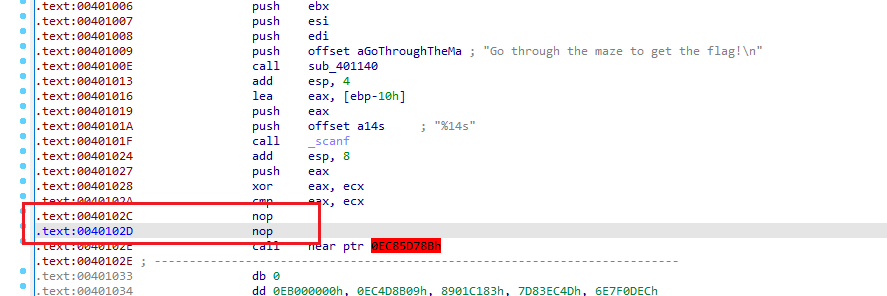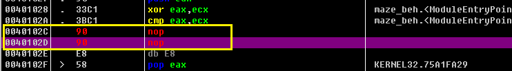 - 先将第一个数据nop掉再转成代码,进行尝试。这里用OD再nop掉 db E8 ,方法相同,再保存到可执行文件重新用IDA打开