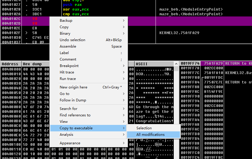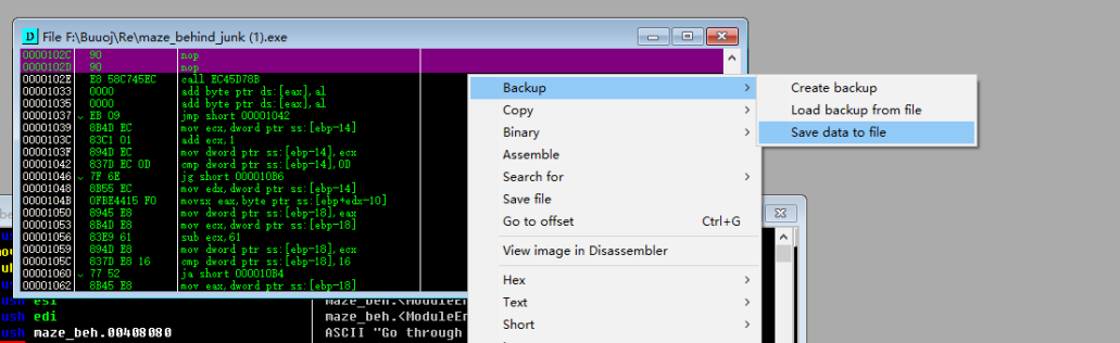 - 这里需要注意,此处在内存中的修改不会自动保存到可执行文件中,需要右键,将修改保存到可执行文件