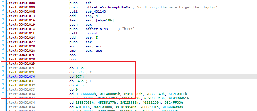 - [续前节]不过这里的main函数还是不能反编译。后面这个call指令,不能全部nop,因为后面那个东西可能是有效代码。D键将其先转换为字节数据