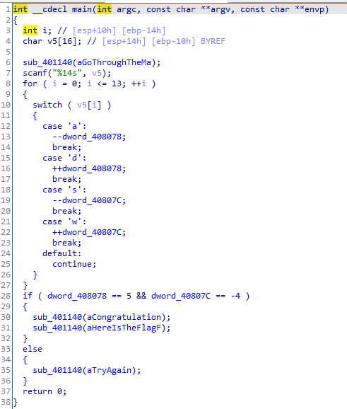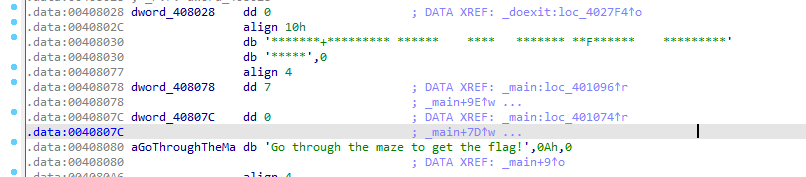 - 可以整理到7行10列的迷宫,走法为ssaaasaassdddw,正好14步,符合main中for循环的设定,所以 flag{ssaaasaassdddw}