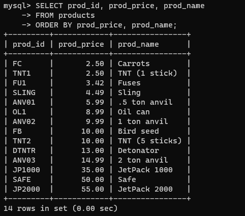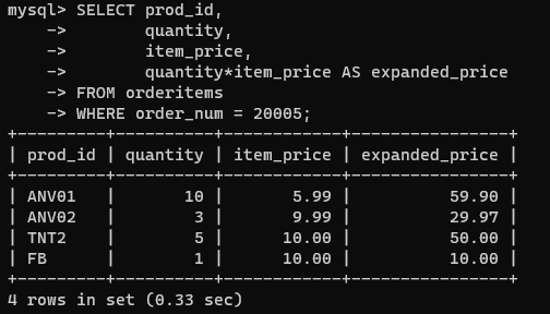 1 | SELECT prod_name, vend_name, prod_price, quantity |