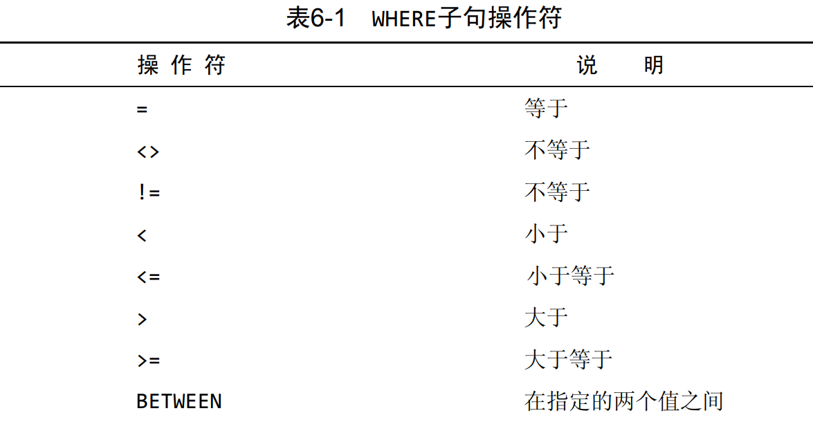 WHERE 列名 IN (值1,值2,...)括号内的条件都可以匹配 - NOT 操作符:否定后面跟的条件(NOT IN)