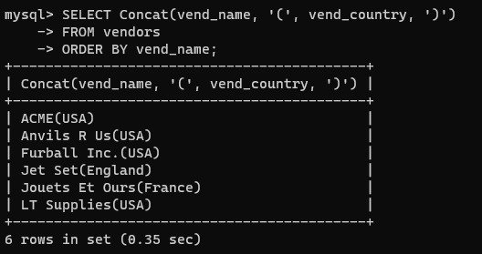 1 | SELECT Concat(vend_name, '(', vend_country, ')') |