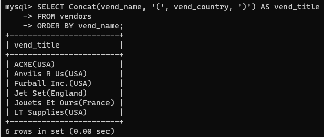 1 | SELECT Concat(vend_name, '(', vend_country, ')') AS vend_title |