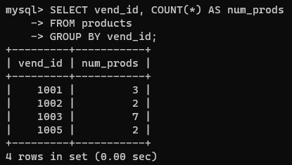 1 | SELECT vend_id, COUNT(*) AS num_prods |