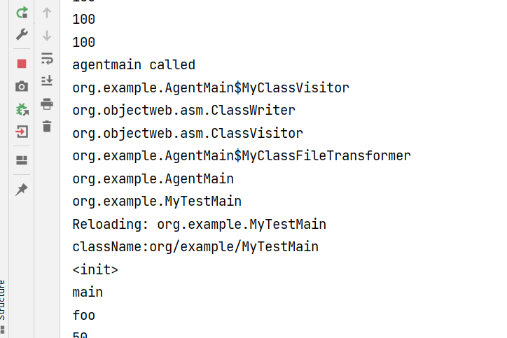 测试代码中的main方法,每3秒输出foo的返回值100。后面会Attach上MyTestMain,修改foo的字节码,让foo返回50