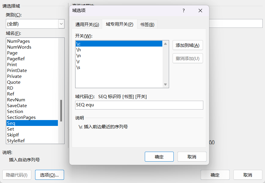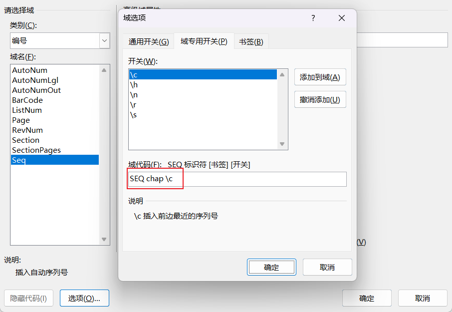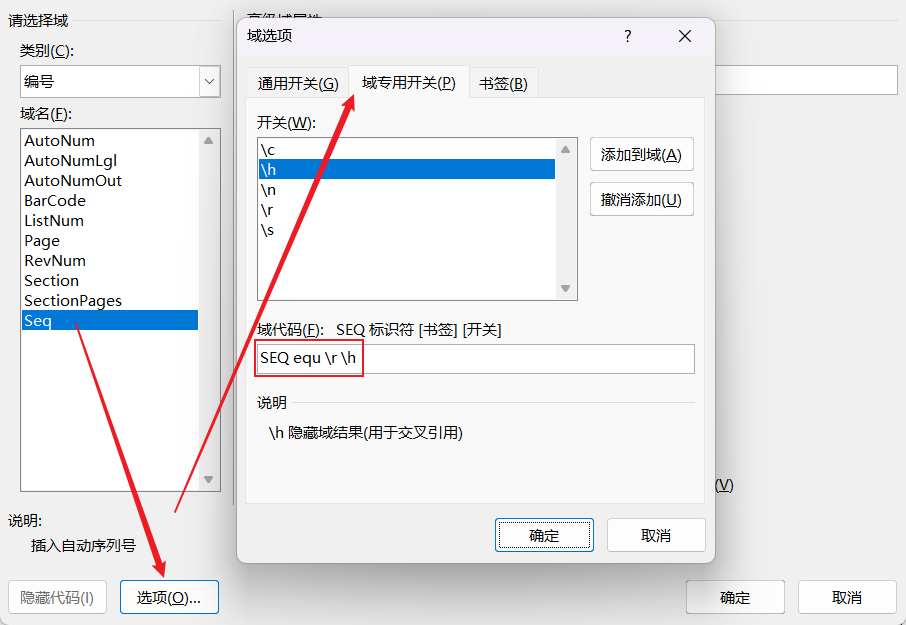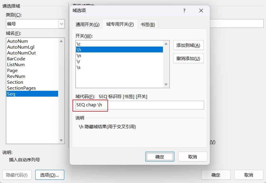 文章图表题注的章节编号汉字改成数字 发表于 2022-04-11 | 更新于: 2022-04-11 | 分类于 解决方案 | 本文总阅读量 次 字数统计: 146 | 阅读时长 ≈ 1 参考 设置多级列表用默认格式没有问题 在章节标题后添加域代码 Ctrl+F9生成域代码的编辑区 在右键编辑区,点击编辑域,选择Seq,点击选项,点击域专用开关,输入equ,然后添加-r -h开关 确定 Ctrl+F9再添加一个 给图表插入题注注意不包含章节编号 章节编号域代码为 序号为 添加交叉引用 选中某个域代码生成的编号 插入,书签 需要使用时插入交叉应用即可 ----------- 本文结束 -----------