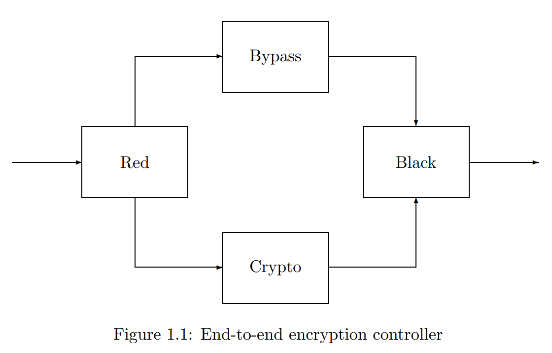 明文消息到达控制器的Red侧;它们通过加密设备发送;它们的报头必须保持为纯文本,以便网络交换机能够解释它们,通过旁路发送。邮件头和加密正文在Black部分重新组装,并发送到网络上。我们想在这里指定的安全策略是,信息从红色流向黑色的唯一通道必须是通过加密和旁路的通道。因此,许多信道控制策略的一个重要特征是,表示允许的信息流的边缘是不可传递的:允许信息通过加密和旁路从红色流到黑色,但不能直接这样做。