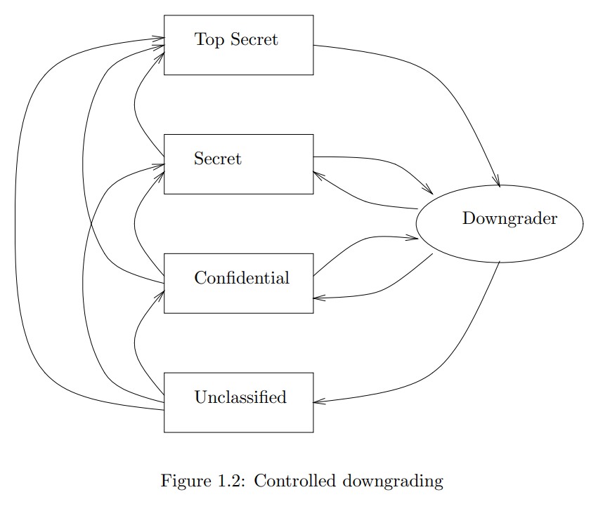 另一个示例如图1.2所示,其中传递元素和不传递元素相结合。左边的边表示美国使用的分类级别之间的传统传递流关系。右侧是进出特殊降级器域的边,这些边是非传递的。这些边表示的流是非传递的,因为尽管信息可以通过降级器从绝密域流向机密域,但它不能直接从绝密域流向机密域。因此,信息可以在安全级别上“向上”流动而不受限制,但只能通过可能受信任的降级器域的中介“向下”流动。
